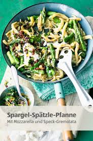 Ein Glucklichmacher Fur Fruhlingstage Deftige Spatzle Pfanne Mit Grunem Spargel Mozzarella Und Speck Gremolata So Einf Aldi Rezepte Lebensmittel Essen Essen