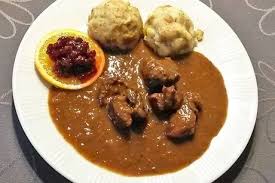 Hirschgulasch Mit Serviettenknodeln Und Rotkohl Hirschgulasch Rezept Leckeres Essen Gulasch