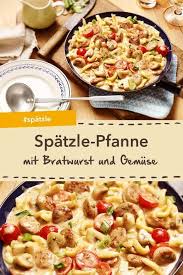Begeistere Deine Familie Mit Der Bratwurst Spatzle Pfanne Mit Frischen Champignons Fruhlingszwiebeln Und Tomaten Bratwurst Wurstchen Gerichte Mit Spatzle